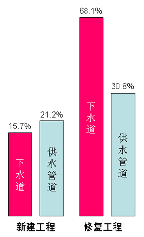 總體來說,預(yù)計(jì)在2006年的下水管道和供水管道的新建施工會比去年增加6.5%,達(dá)82.6億美元,修復(fù)市場增加10.1%,達(dá)49.7億美元,新建與修復(fù)市場合計(jì)約為132.3億美元。美國施工單位不再將非開挖視為一種神奇的技術(shù),而是作為一種實(shí)用的工程施工技術(shù)對待。他們知道非開挖能做什么,不能做什么,最關(guān)心的是總的費(fèi)用和社會效益。在允許開挖的地方,有時兩種方法會并用。美國的市政部門估計(jì)2006年有15.7%的新鋪設(shè)管道工程將用非開挖方法施工,68.1%的修復(fù)工程將用非開挖方法完成。在供水管網(wǎng)領(lǐng)域,21.2%的新建工程和30.8%的修復(fù)工程將使用非開挖方法。下圖圖示了美國2006年非開挖施工新建與修復(fù)市場的非開挖施工所占份額。