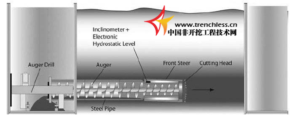 當先導管到達接收井時,螺旋鉆孔階段就開始了。在這個步驟中套管和螺旋鉆桿被連接到最后一根先導桿上,螺旋鉆桿和套管被頂進的同時螺旋鉆桿在套管里旋轉;開挖出來的碎屑被運回出發井,然后再收集到渣土吊斗里。與此同時當套管和螺旋鉆頭達到接收坑時,先導管被拆除。