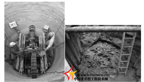 和常見的土層施工方法一樣———前導系統使用了已被驗證效果良好的光學導向系統,它包括了帶孔內照相機的定向儀、監視器和LED 目標顯示屏。如圖2 所示,巖土體通過切削頭被連續的開挖,再通過具有空心的螺旋鉆桿將碎屑運輸到出發井。導向管通過地層的反作用力來導向。機器操作人員能實施遠程操控來完成操作,通過人工或自動模型使導向管上下擺動,之后在控制板上顯示出切割頭的方向。